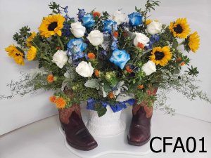 These Roses, Delphinium, Safflower, and Sunflowers are Sweet and Memorable for any Funeral. (Boots not included)