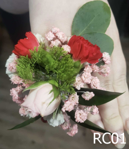 A Wire Ring Corsage with Mini Carnation, Spray Rose, Trachelium, Gyp, and Greens.