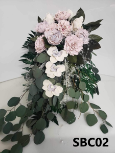 This cascade bouquet holds many greens, along with gyp, hydrangea, and orchids.