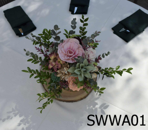 Sola Wood Flowers with Real Greens in a Lotus bowl with colored water beads.