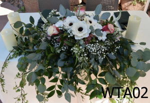 A Table Arrangement for the Bride and Groom. Rose’s, Sola Wood Flower’s, Gyp, and lots of Greens.